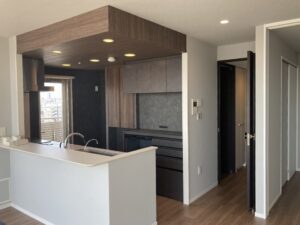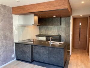 黒とグレーのモルタル調の仕上げに下がり天井をプラスし、まるでホテルのような高級感あるキッチンに✨
