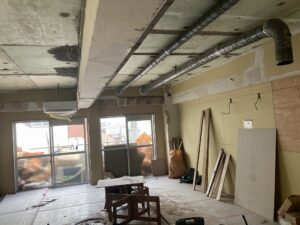 解体作業が進むと、2つの部屋が1つにつながり、広々としたリビングの形が見えてきます。