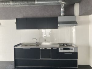 そこで今回採用したのは、クリナップの『ラクエラ』。 ブラックのキッチンと、コンクリ調の天井&剥き出し配管が絶妙にマッチし、 スタイリッシュで洗練された空間に生まれ変わりました。
