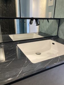 ブラックのアクセントパネルが空間を引き締め、まるでホテルのバスルームのような印象に。